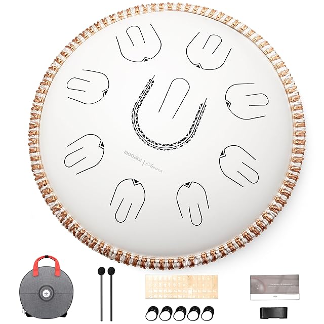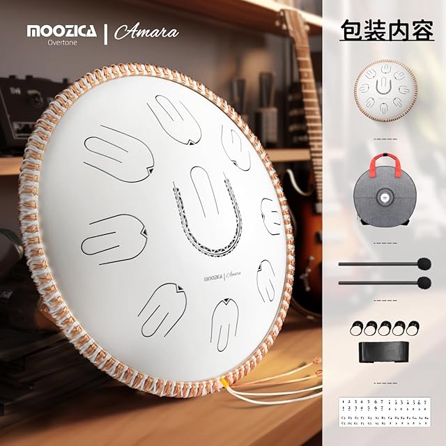 【必要な付属品がすべて揃っています】MOOZICAハンドパンには、収納バッグ、学習用説明書、ウールカバー付きドラムスティック、フィンガータッパーが付属しており、演奏や学習に必要なものがすべて揃っています。練習と試行錯誤を重ねながら、ハンドパンであなただけの演奏スタイルを確立し、美しく表現力豊かな音楽を創り上げてください。