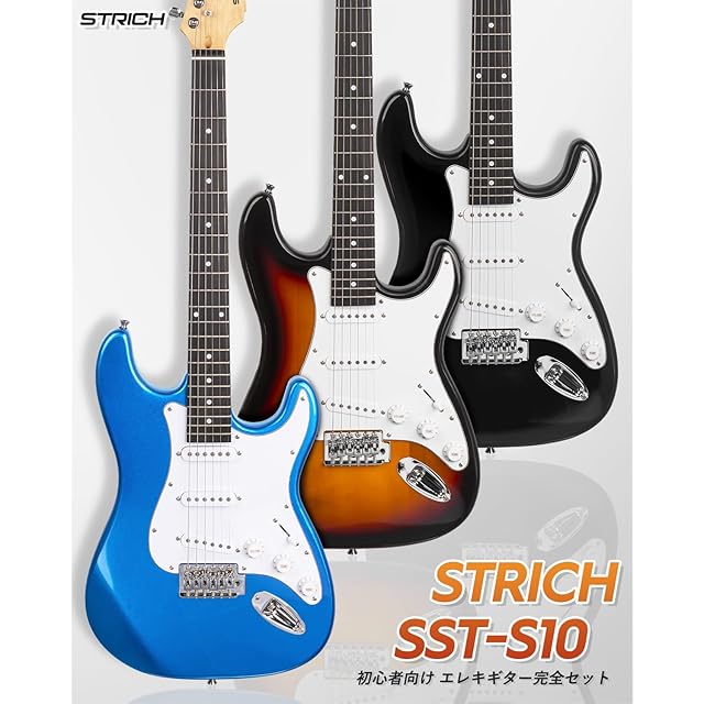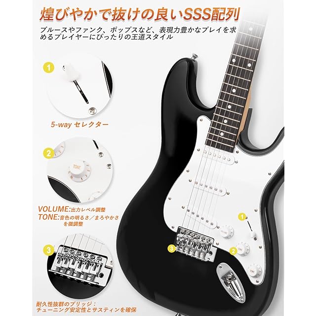 STRICH エレキギター 初心者セット フルサイズ STタイプ SSSピックアップ配列 39インチ ポプラ材 ミニアンプ付き 専用ケースとチューナーなどアクセサリーセット ブラック