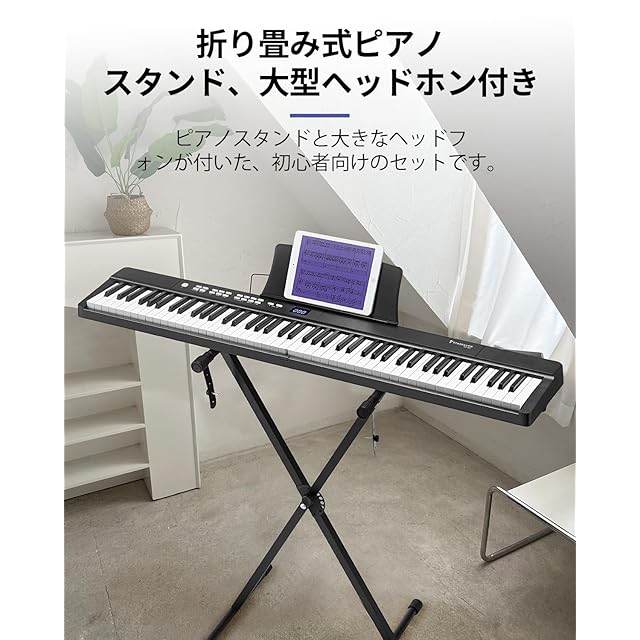 【豊富な付属品】ピアノスタンド、大型ヘッドセット、サスティンペダル、ポータブルキャリングバッグが付属しており、このピアノキーボードセットは、あなたの音楽の旅を始めるための理想的な機器です。