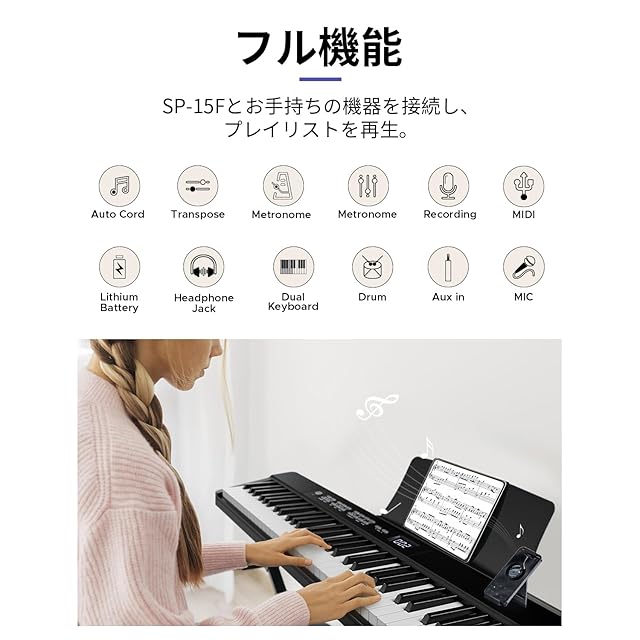 【ワイヤレス MIDI&多彩な機能】SP-15FキーボードにはBluetoothが搭載されており、お気に入りの曲や学習アプリと簡単に連携できます。128音色、128リズム、80デモ・ソング、録音機能を搭載し、初心者の方にも安心してお使いいただけます。
