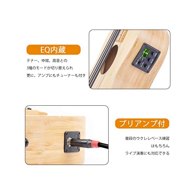 【チューナー・プリアンプ搭載】--- チューニング、低域、中域、高域との3バンド・イコライザーの切り替え、音量調整を備える機能性高いEQを内蔵しており、演奏者に多くのニーズにできるだけ満たします。プリアンプへの接続も可能で、ご自宅での練習はもちろん、ライブの演奏にも強い味方と言えるウクレレベースであります。