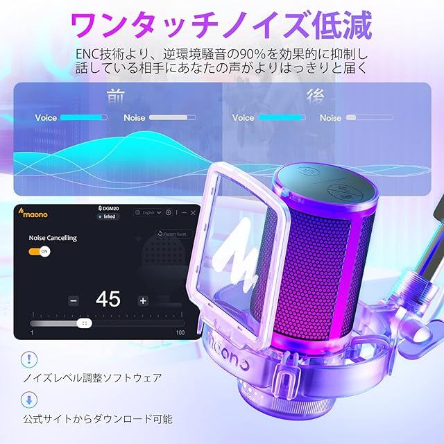 MAONO USB コンデンサーマイク ゲーミングマイク PC マイクセット ノイズキャンセリング ミュートボタン 単一指向性 RGBライティング 音量コントロール プラグ&プレイ パソコンマイク ゲーム実況 ライブ配信 ポットキャスト ストリーミング Skype Discord Zoom Windows/Mac/PS4/PS5対応 GamerWave DGM20S 透明紫