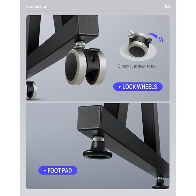 【スイベルキャスター付き】 4つの耐久性のあるスイベルキャスターが付いているので、キーボード台を楽に動かすことができます。移動する必要がない場合は、付属のマットを切り替えて固定することができます。ツールは不要で、ページのインストールビデオを参照することで簡単に交換できます(ご注意:電子ピアノを置いた後、スイベルキャスターをロックして意外な破損を避けることを忘れないでください)