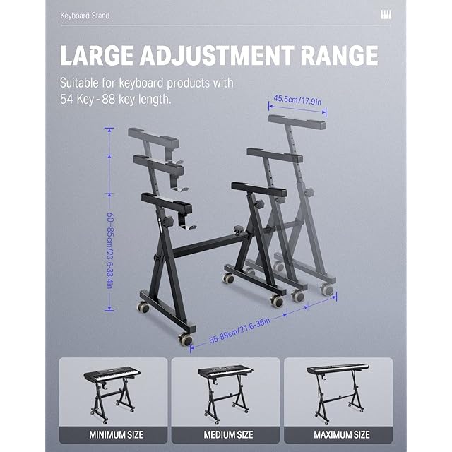 【調節可能&広い互換性】Donner Z型電子ピアノスタンドの幅調整は7段あり、55cm-89cmの範囲で調節可能で、54/61/76/88鍵の電子ピアノ・MIDIキーボードなどに対応します。高さの調節範囲は60-85cmで、立っていても座っていても、必要に応じて高さを調整できます