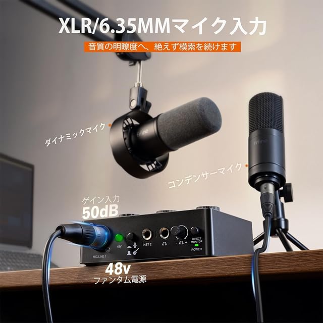 【安定性抜群のXLR仕様】XLR端子が搭載されており、XLRマイクを自由自在に接続し、プロのボーカルをキャプチャすることができます。 コンデンサーマイクを直接使用するために、48Vファンタム電源の利便性と、入力レベルを微調整する直感的なマイクゲインノブを楽しみましょう。