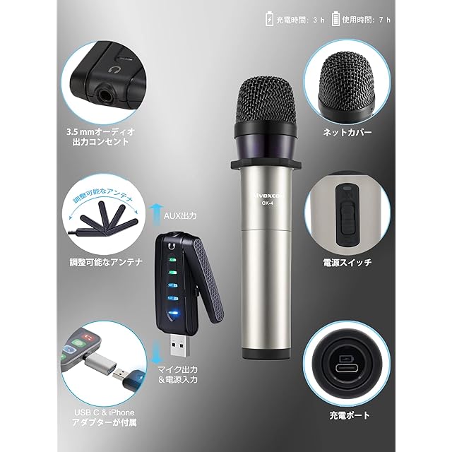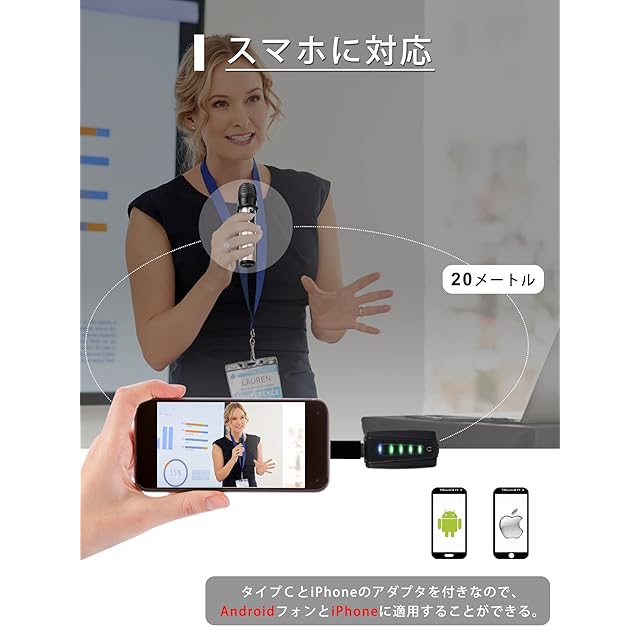 【UHF無線伝送技術】 :従来のBluetooth 2.4 G無線技術とは異なり、当社のワイヤレスマイクシステムは、安定性能と耐干渉性能を備えたUHF無線伝送技術を採用しており、超高周波を有しており、Wi-Fi信号に干渉されない。送信距離は最大20メートルになります。※ご注意:混信の可能性があるので、50メートル以内に複数セットを一緒に使用することは勧められません。ご承知くださいませ。