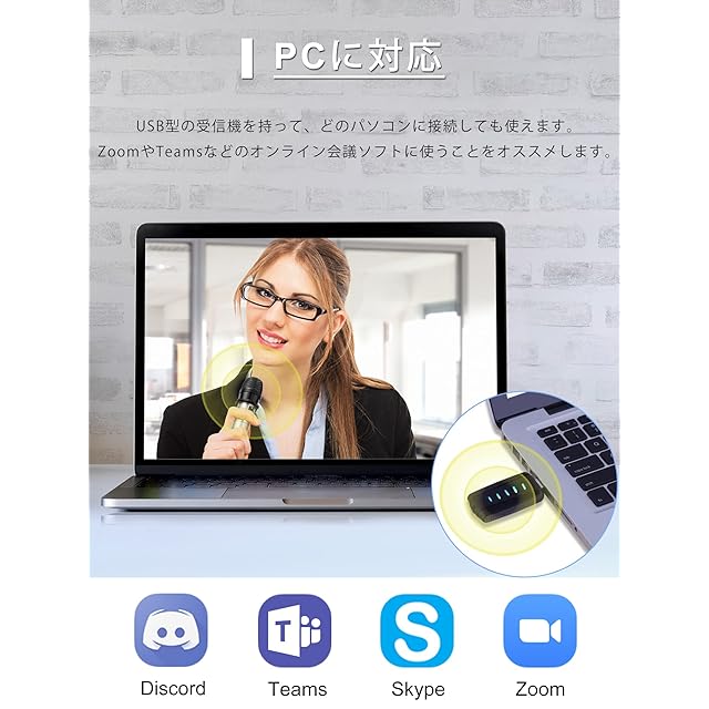 【PCやスピーカーに対応が最適】:この無線マイクはUSB型の受信機を持って、どのパソコンに接続しても使えます。zoomやteamsなどのオンライン会議ソフトに使うことをオススメします。AUX変換ケーブルも付属するので、aux/lineジャック付きのスピーカーに接続して拡音することもできます。ヘッドホンに接続してモニタリング機能も実現できます。会社会議や学校授業の中では絶対に重宝です!