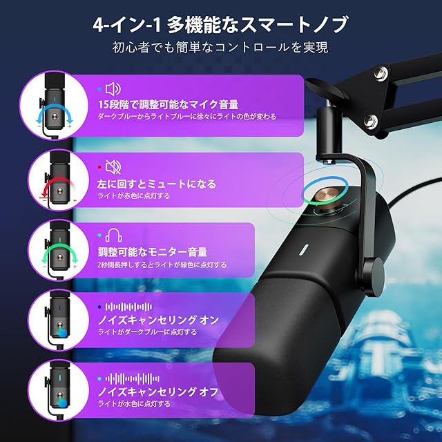 【4-イン-1 操作簡単なコントロールノブ/15レベル ゲイン&モニター音量/ミュート(解除)機能】 わずらわしい感度設定を行う必要がなく、初心者でも手軽に本格的な録音ができます!多機能なコントロールノブでマイクの音声設定[ゲイン/モニター音量&ノイズキャンセリング オン/オフ&ミュート(解除)]を素早く調整できます。オーディオや使用環境に合わせた異なる音量レベル設定を可能とし、プロクオリティのサウンドが簡単に手に入ります。また、リアルタイムモニタリング機能に基づいて、入力音声は原音に近い形を忠実に描くこともできます。