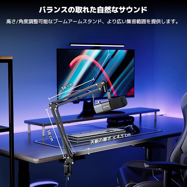 【ビジネスパーソン/ライブ配信者向けの超単一指向性ダイナミックマイク/調整可能なブームアームスタンド付き】 NearStream AM10X スーパーカーディオイド マイクは側面と後方からの収音を抑え、マイクの正面からの音声だけをしっかり捉えることができます。抜けのよいサウンドを必要とする録音/音楽・動画配信/ゲーム実況といったシーンにうってつけです。ブームアームスタンド(付属品)に固定して使用しできます。お使いのチェアやデスクによっては、自分の理想的な距離・角度・高さに調節できます。自宅で楽器を弾きながら歌を録音するしたりする場合にも使いやすいです。[ビット幅:24bit/最大音圧レベル:≥125dB SPL/信号対雑音比:≥70dB SNR/収音距離:30cm]