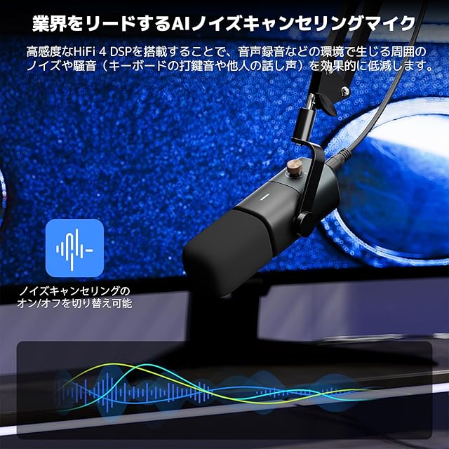 【最もクリーンでクリアなボーカル録音を瞬時に実現&ノイズキャンセリングのオン/オフを切り替え可能】 自社開発のアルゴリズムによる次世代のAIノイズキャンセリング技術が登場!捉えたい音を最大限に拾い、破裂音(ポップノイズ)やピーピー音(ハウリング)などの不要な音が入るのを最低限に抑えられます。音声の再現性と表現力を向上するだけでなく、微細なディテールやニュアンスも感じられます。フォームウインドスクリーンと組み合わせて使用することで、人の息づかい/キーボードをカタカタ叩く音/エアコンのファンノイズをより効果的に除去できます。また、「ノイズキャンセリング」機能をオフにし、周りの環境音を残すことも可能。