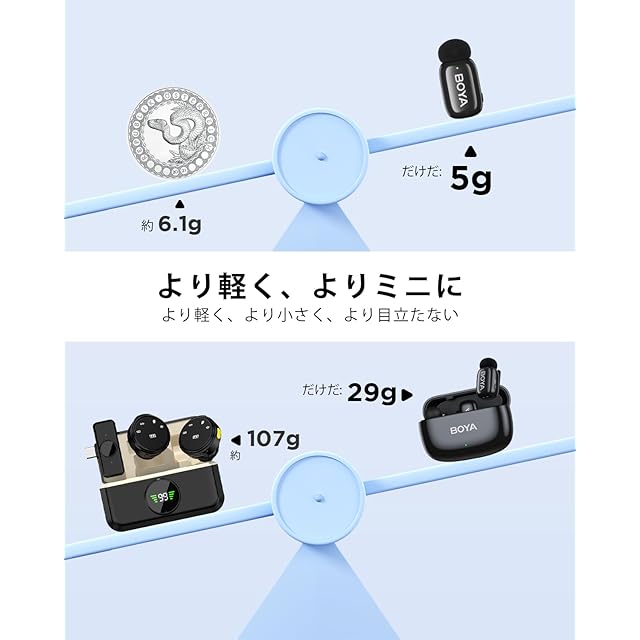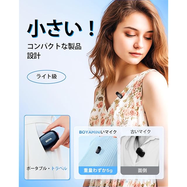 【MINIだけどパワフル】BOYA MINI ワイヤレスラベリアマイクは、わずか5グラムの軽さで、ポッドのような形状が特徴。外出時にも最適なパートナーです。BOYAの小型ラペルマイクは、カメラバッグやポケット、バックパック、小さなハンドバッグなどに収納可能なポータブルワイヤレスマイクで、ロスレスCD品質のサウンドを提供し、プロフェッショナルな録音デバイスです。