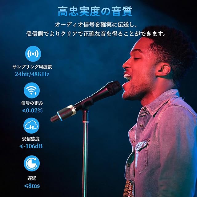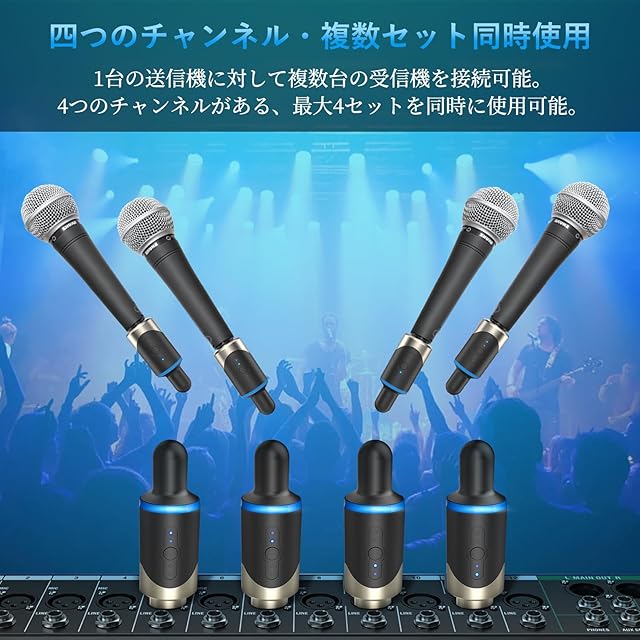 【強力な抗干渉能力】送信機と受信機はプロフェッショナルなUHFワイヤレスデジタルオーディオ伝送技術を採用しています。自動ペアリングでき、30メートル以内の無線伝送は低遅延安定送信の信頼性があります。4つのチャンネルがあり、4セット併用可能。また1つの送信機に対して複数の受信機は接続できます。※1つの受信機に対して複数の送信機は接続できません。