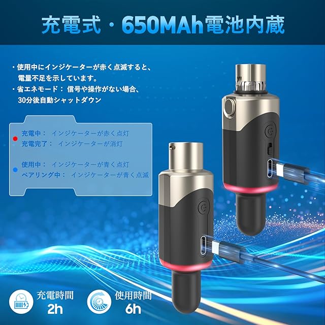 【充電式】ダブルポート充電ケーブルで送信機と受信機を同時に充電でき、充電ポートは使いやすいUSB-C(Type-c)を採用しています。フル充電後は6時間使用可能です。インジケーターは動作と充電状況と電量不足を示します。省エネモードで、信号や操作がない場合、30分後自動シャットダウンします。