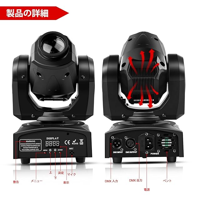 [ 動作モード ]DMX 512 / リモート / マスタースレーブ / サウンド起動 / 自動 / ストロボなどの 6 つの動作モード、自由に選択可能、音楽リズムは敏感です。