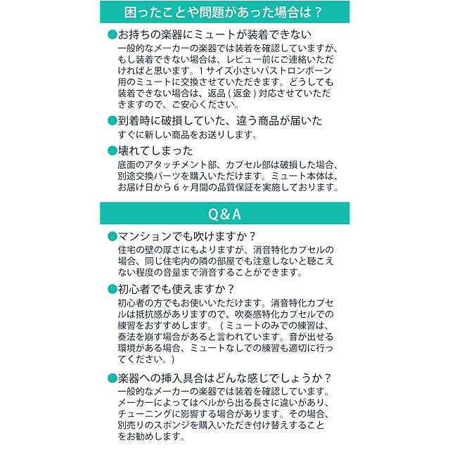 【音量参考値】●ミュート無し(オープン):66~101dB ●消音特化カプセル:42~71dB ●吹奏感特化カプセル:45~78dB ●音色特化カプセル:46~75dB ※楽器から1.5mの位置で計測 ※実際に演奏している計測値なので、音量にムラがあります。 ※計測する距離や環境によっても計測値は変わりますのであくまで参考値です。