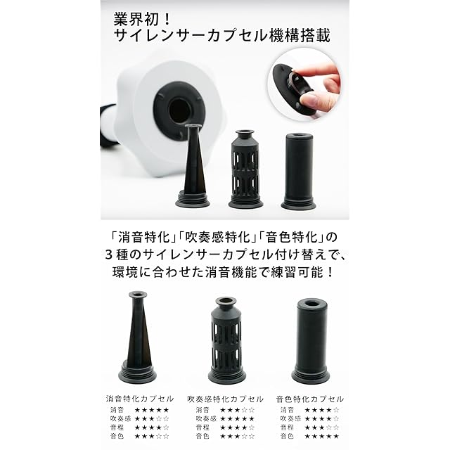 業界初!サイレンサーカプセル機構搭載。3種類のカプセル付け替えで様々な機能を1つのミュートで。環境に合わせた消音機能で練習ができる