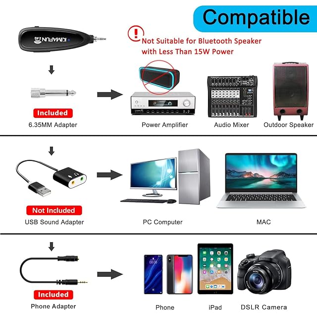 【プラグ&プレイ】本製品は2.4GHzワイヤレス伝送を採用し、送信機と受信機の両方を同時にオンにするだけで、2秒以内に自動接続できます。無料のYスプリッターを備えており、3.5mm受信機はiPhone、Androidフォン、タブレットに適しています。パッケージには、音声アンプ、オーディオミキサー、および屋外スピーカー用の無料の6.35 mmアダプターが含まれています。適切なアダプターを使用してデバイスに受信機を取り付けると、最高の音質を得ることができます。