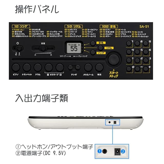 セット内容:Casiotone(カシオトーン) ミニキーボード SA-51(ブラック×ライトグレー)/アダプター AD-E95100LJ/マイクロファイバークロス