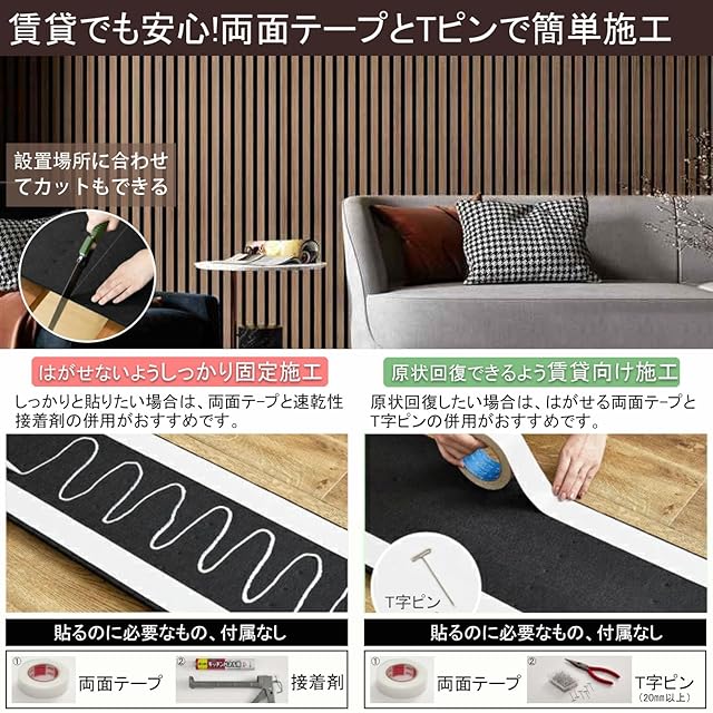 【設置簡単&自由にカット可能】取り付けとお手入れが簡単な吸音材です。背面に接着剤を使用して壁に貼るか、釘を使って簡単に取り付けることができます。賃貸物件でも問題なく利用できます。クッション部分はカッターなどで簡単に切ることができ、設置場所やデザイン、お好みに合わせて調整できます。ご注意:接着剤や釘など付属しておりません。