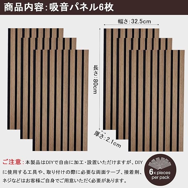 【商品詳細】サイズ:(約)幅32.5cm×高さ80cm×厚さ2.1cm ※1枚あたり、重量:(約)kg ※2.1枚あたり、全6枚入り、材質:天然木目の圧板 + 中密度繊維板 + 高密度吸音ポリエステル繊維、施工面積:1.56平方メートル。取り付けに必要な接着剤と釘は、お客様ご自身でご用意いただく必要があります。