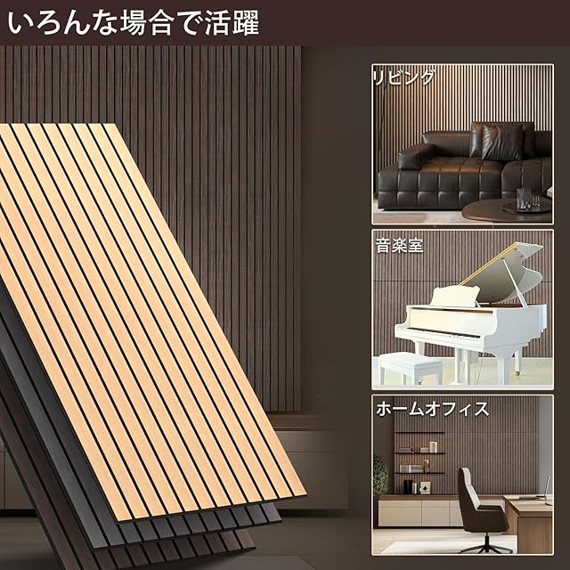 【利用場合】この木目調の防音パネルは、自然な風合いを持つ美しいデザインで、さまざまなインテリアスタイルにぴったり合います。リビングルーム、寝室、オフィス、レストランなど、幅広い場所で使用できます。また、取り付けが簡単なので、DIYプロジェクトにも最適です。