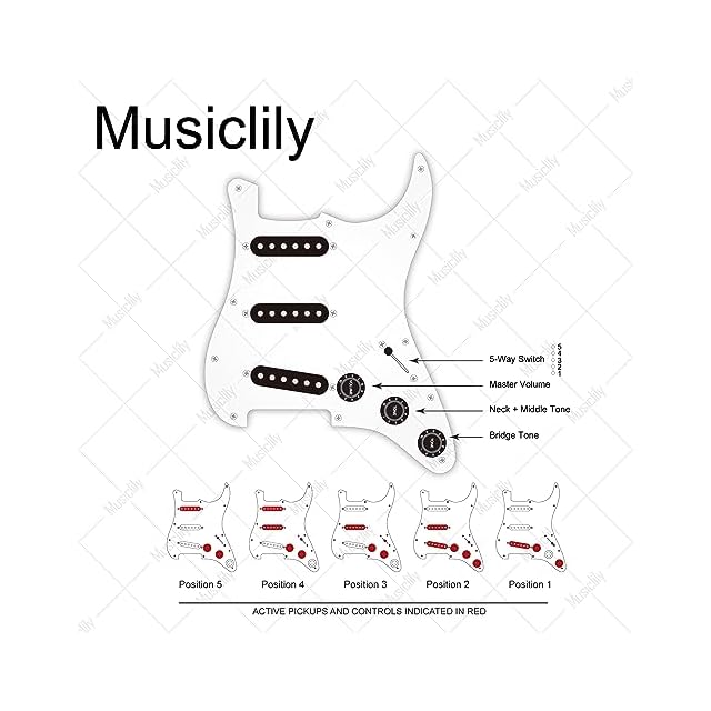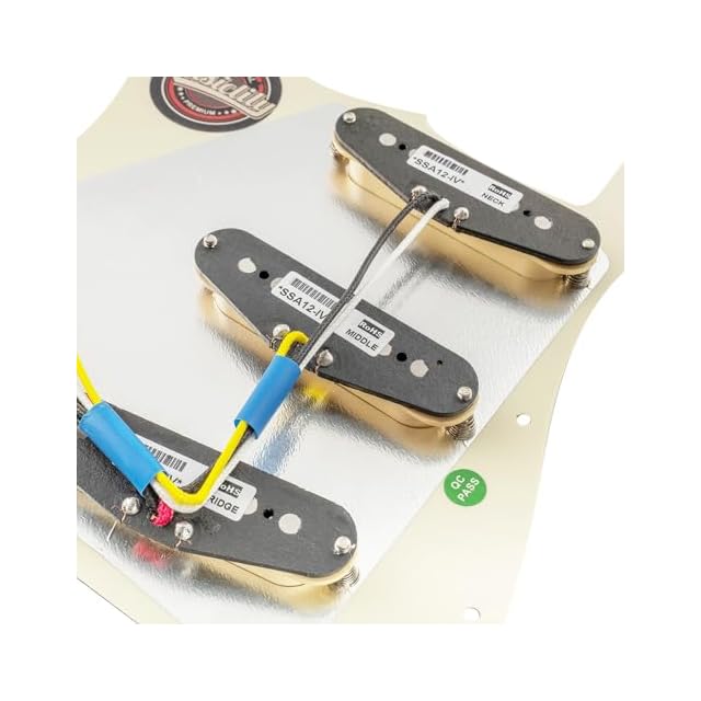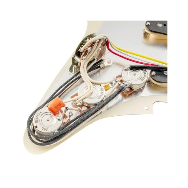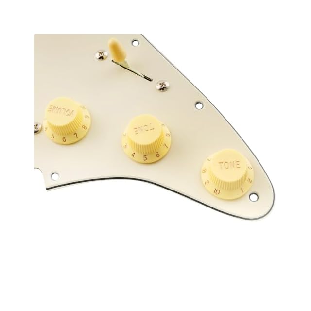 パッケージ内容:1枚の配線済ピックガード。ArtecピックアップDC Resistance(ネック/ミドル/ブリッジ):6.3K/6.5K/6.5K、マグネット:アルニコ5、ポールピースピッチ:10mm/10.4mm/10.4mm。ポット:ブラス製A250Kx 3。インポート韓国製5WAYスイッチとジャック、Orange Drop 0.022µFコンデンサー