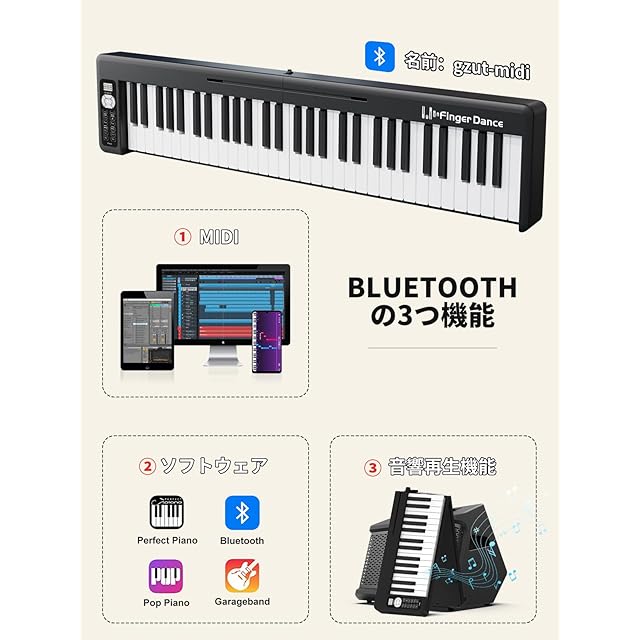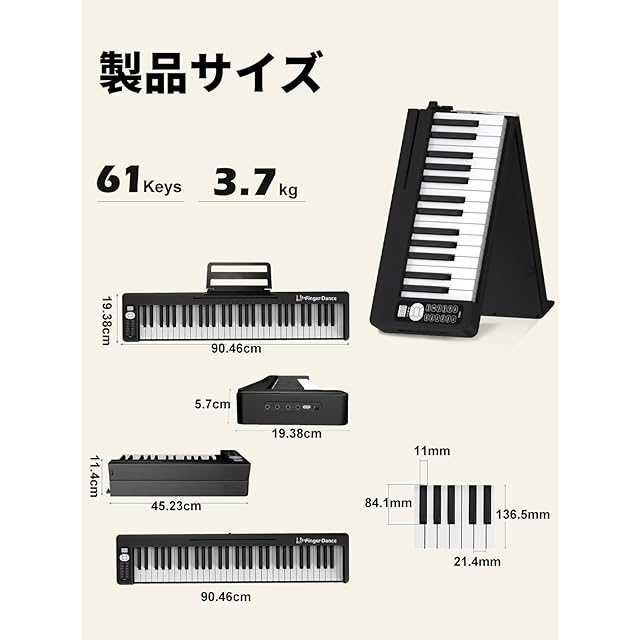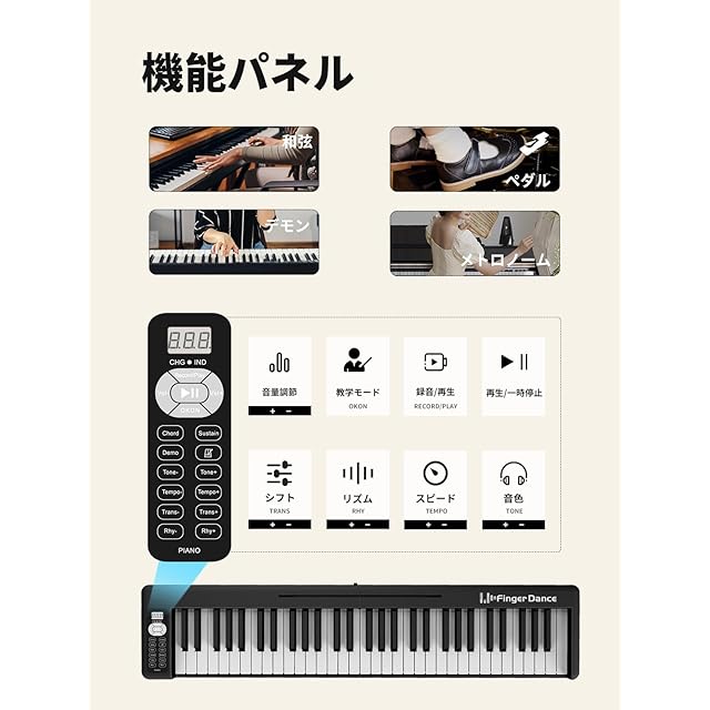 finger danceの最新デザイン--ライト付きFX-11電子ピアノ。クラシックな白黒配色を採用した木目調キーボード。琴身は安全なabs素材を使用しており、軽い。ピアノは折りたたむことができ、収納しやすい。さらに高音質音源チップを採用し、グランドピアノの音質を復元します。もしピアノに何か問題があったら連絡してください。直接無料交換いたします。