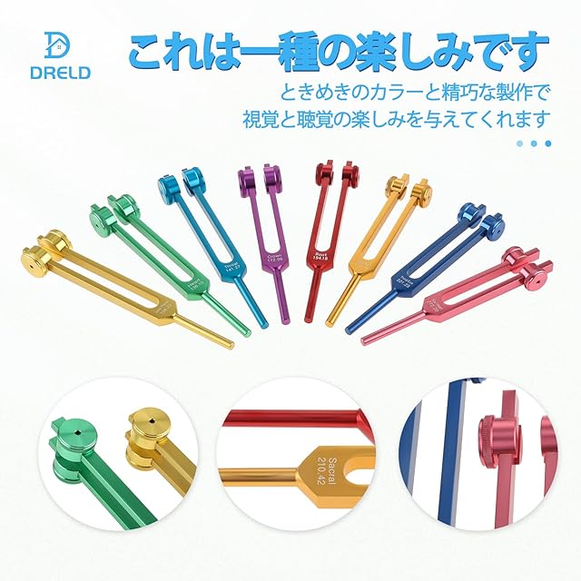 Dreld チャクラ 音叉セット ソルフェッジオ音叉のセットDNA修復ヒーリング サウンドセラピーツール 音叉8個+2シリコンハンマー付き 126.22 Hz, 136.1 Hz, 141.27 Hz, 172.06 Hz, 194.18 Hz, 210.42 Hz, 221.23Hz, 272.2Hz バッグとクリーニングクロス付き バランシング、振動用 楽器 虹色