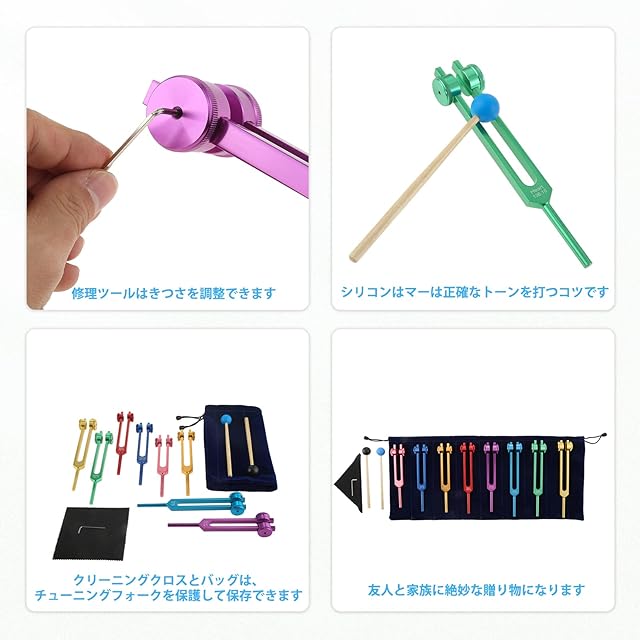 【パッケージ内容】 8個の音叉セットには126.22 Hz、136.1 Hz、141.27 Hz、172.06 Hz、194.18 Hz、210.42 Hz、221.23Hz、272.2Hzの音叉、マレット、バッグとクリーニングクロスが含まれています。