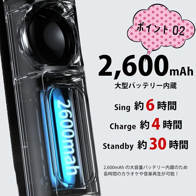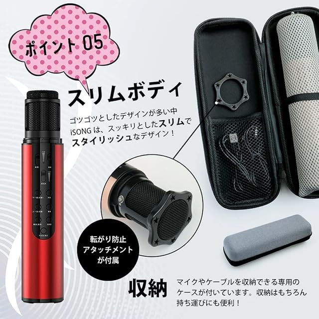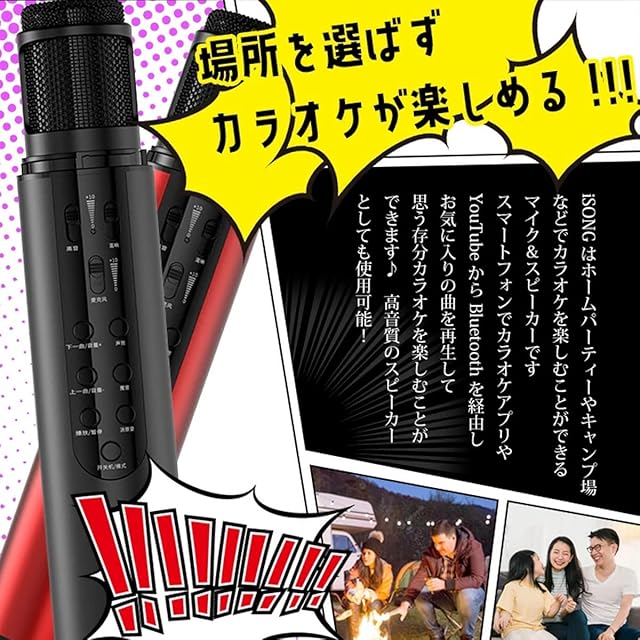【マイク&スピーカー】iSONGは、ホームパーティーやキャンプ場などでカラオケを楽しむことができる、マイク&スピーカーです。スマートフォンでカラオケアプリやYouTubeからBluetoothを経由し、お気に入りの曲を再生して思う存分カラオケを楽しむことができます♪高音質のスピーカーとしても使用可能!スピーカーは、最大出力10Wのダブルスピーカー搭載。2,600mAhの大容量バッテリー内蔵のため長時間のカラオケや音楽再生が可能です。ボイスチェンジ(男性/女性/子供)やボーカルカット、エコーなど機能も充実。さらに付属の専用のマイクスタンドホルダーを使えば本格的なマイクに早変わり!動画の実況や歌の録音に集中できます。子供から大人まで楽しめる本格的マイク!1台あれば様々なシーンで盛り上がること間違いなしです☆