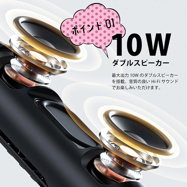 【製品仕様】 スピーカー:40mm 45W/受電電力:5V1A/充電時間:約4時間/駆動時間:約5~6時間/バッテリー:2,600mAh/ピックアップ:ダイナミックマイク/SDカード再生フォーマット:MP3、WMA、WAV/Bluetooth通信距離:10M以下/出力:5W+5W/音源入力:Bluetooth・SDカード・AUX接続