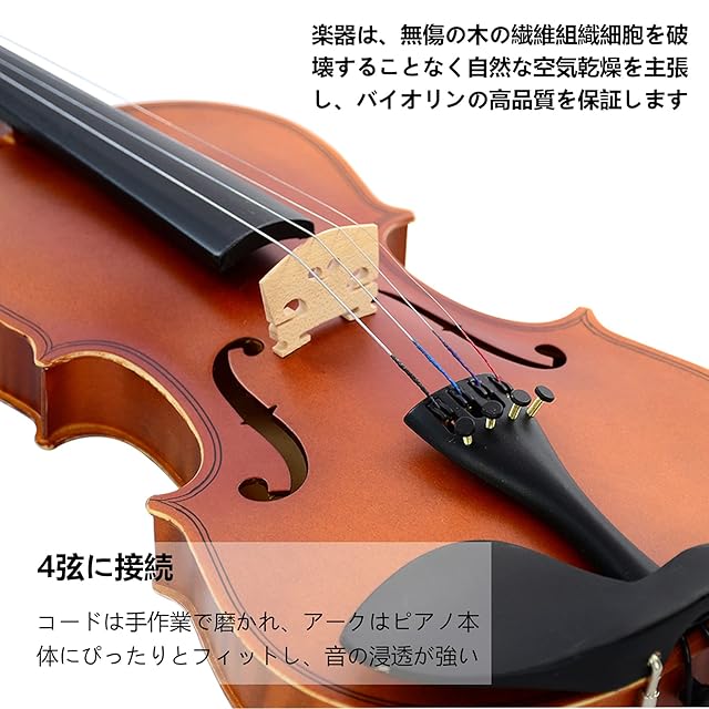 【取り扱い注意】この初心者向けバイオリンは、他の多くの楽器と同様に繊細です。配送中の損傷を避けるため、ブリッジはセットアップされていないことに注意してください。注意:調整ペグは慎重に扱い、調整時には押し込みながら行ってください。
