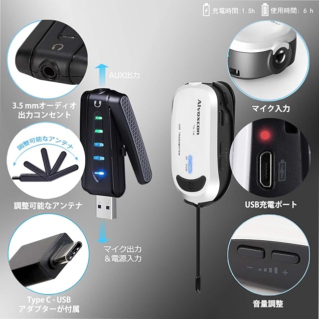 USB ワイヤレスマイク Alvoxcon 無線マイク ピンマイクワイヤレス イヤホン端子付き PC クリップマイク UHF 録音 動画撮影 拡声 モニタリング パソコン Androidフォン 軽量 日本語説明書 UM310