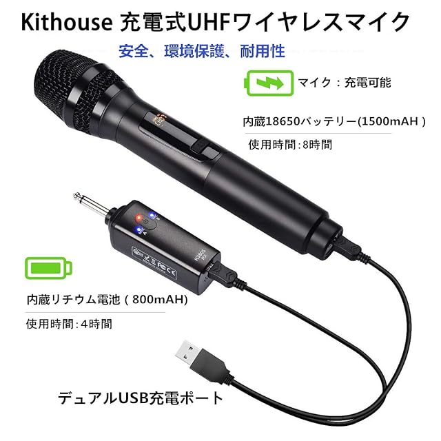 Kithouse K380Sワイヤレスマイク カラオケ 無線マイク 充電式ダイナミックマイク UHF 10チャンネル 技適認証済 ハンドヘルドマイク 6.35mmレシーバ付き 複数台同時使用 日本語取扱書付き 会議 カラオケマイク ホームパーティーに大活躍【2本セット】