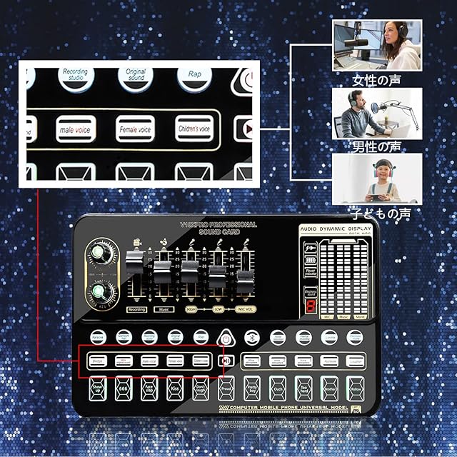 「16種類の効果音」:16種類の特殊効果音、14種類の調整可能な音で、放送の雰囲気を調整。 深みのある低音、滑らかな中音、クリアな高音、生放送でよりいいパフォーマンスをサポートします。