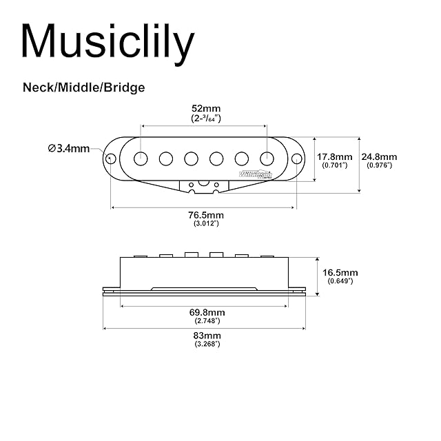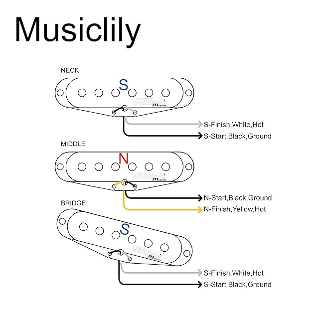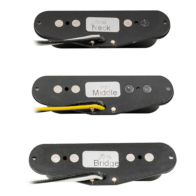 マグネット:アルニコV ; DC Resistance:6.4K(±0.5K)。黒線はアース線、ネックとブリッジの白線はホットワイヤー、中央の黄色または赤線はホットワイヤーです。