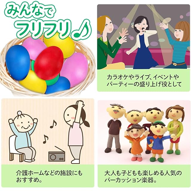【1】大人も子供も楽しめる人気䛾タマゴ型䛾パーカッション楽器、エッグシェーカー䛾セットです。カラオケやライブ、イベ ントやパーティー䛾盛り上げ役として、皆でフリフリ♪