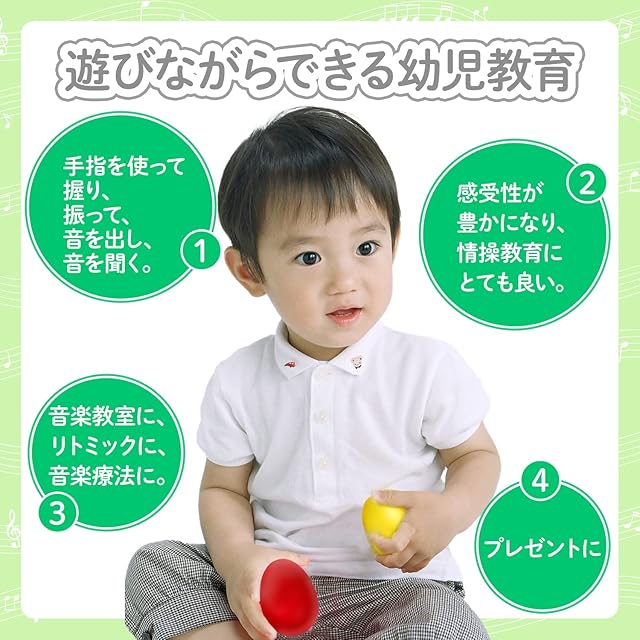 【4】親子で遊びながら手軽にできる幼児教育。手指を使って握り、振って、音を出し、音を聞く。感受性が豊かになり、情操教育にもとても良いとされています。プレゼントに、音楽教室に、幼稚園や保育園のアンサンブルやリトミックに、音楽療法に!さまざまな場面でお使いいただけます。