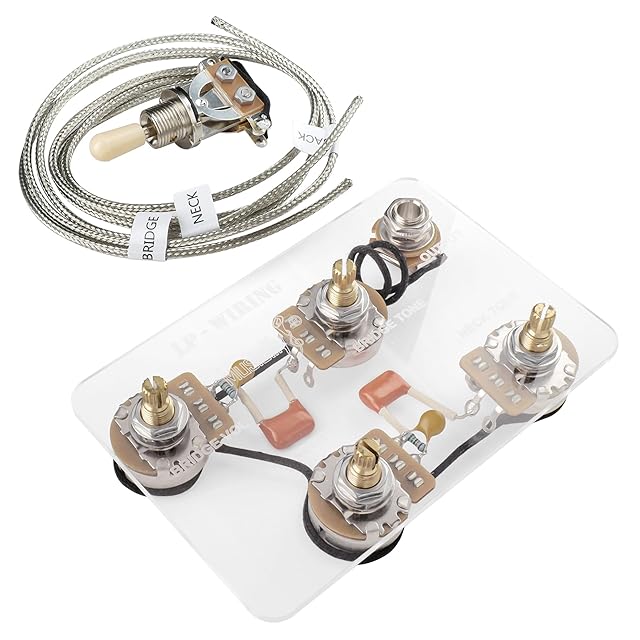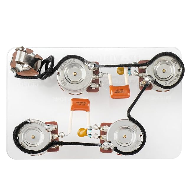 パッケージ内容:付属アクリル板で配線済みキットセット。1つの3way LP スイッチ,4つのポット:ブラスシャフトHD A500K, 2つのコンデンサー:0.022uF Orange Drop, 2つのトレブルブリード,1つの韓国製6.35mmジャック。1本の配線:22ゲージ格のプッシュバッククロスワイヤー、錫メッキのオーバーコート付き, 1冊の配線図付属