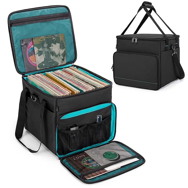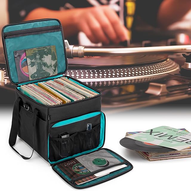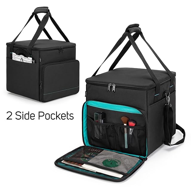 【収納力抜群】レコードバッグには、約60枚の7/10/12インチのレコードを収納できます。フロントポケット1つとサイドポケット2つで、7インチのレコードを複数収納できます。または、アクセサリーやクリーニング用品を収納することもできます。