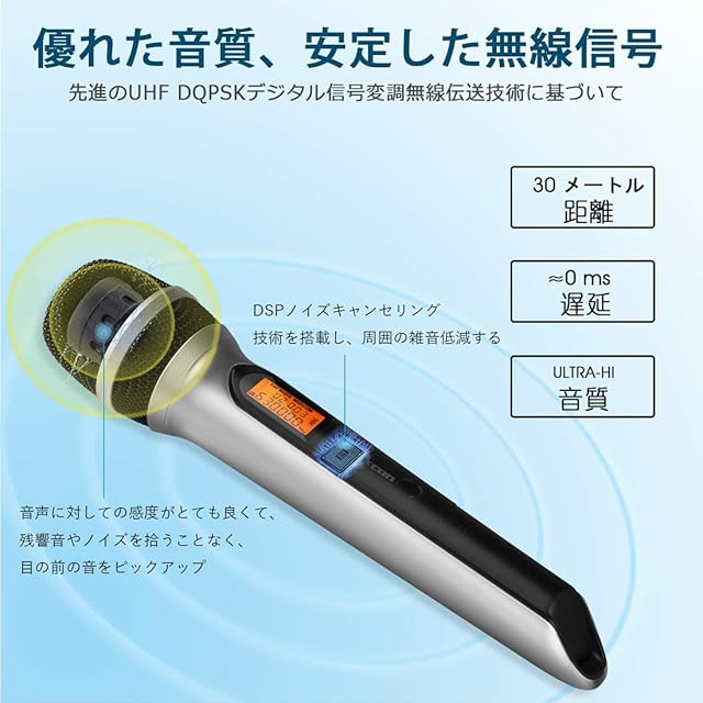 【優れた音質、安定した無線信号】先進のUHF DQPSK デジタル信号変調無線伝送技術に基づいて、高音質と安定した音質、音の伝送が低遅延ということを確保されます。無線信号の到達距離は30メートルまでとなります。ご注意:同じ場所に複数セットを同時に使うと周波数相互干渉のリスクがあるので、各マイクセット単独での使用が推奨されています。