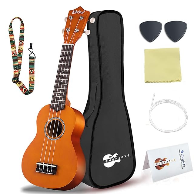 ウクレレ初心者セットには、21インチのソプラノウクレレ、カラフルなストラップ、楽しい弾き方ソングブック、スペアピック2本、スペアストリング、マイクロファイバー製ポリッシングクロス、丈夫で便利なソフトバッグとプリントボックスが含まれています