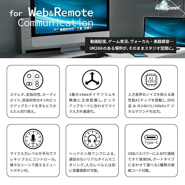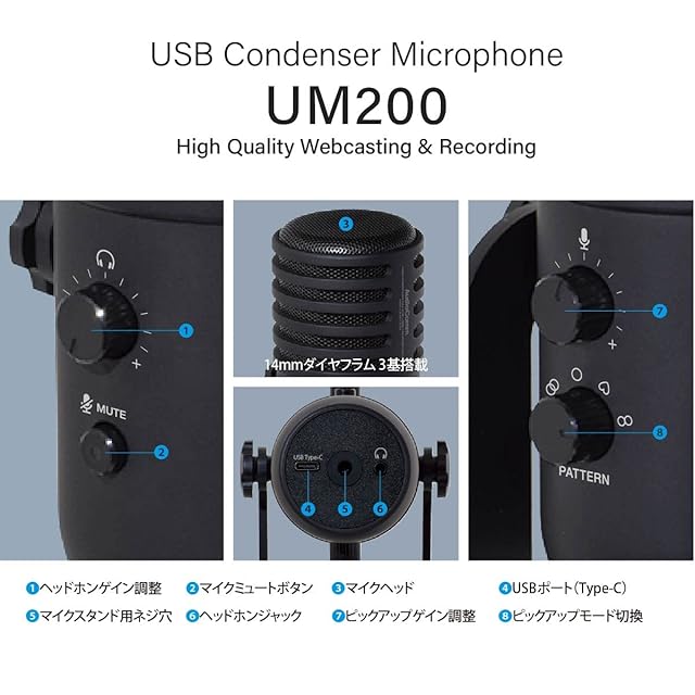【 特 長 】 ◆スタジオレベルのハイパフォーマンスを実現した高性能USBコンデンサーマイク ◆「ステレオ」「全指向性」「カーディオイド」「双指向性」の4つのピックアップモード搭載。手元でかんたんに切り替えができます。・ ステレオ…ステレオ録音全般、バンド演奏など・ 全指向性…Web会議、座談会など・ カーディオイド…Webキャスト・ヴォーカル、ゲーム実況など・ 双指向性…インタビュー、楽器演奏など ◆3基の高性能14mmダイヤフラムを精緻に立体配置し、ピックアップモードに合わせてマイク入力を最適化。 ◆入力音声のノイズを抑える高性能AIチップを搭載し、DVD並みの24bit/48kHzデジタルサウンドを出力。
