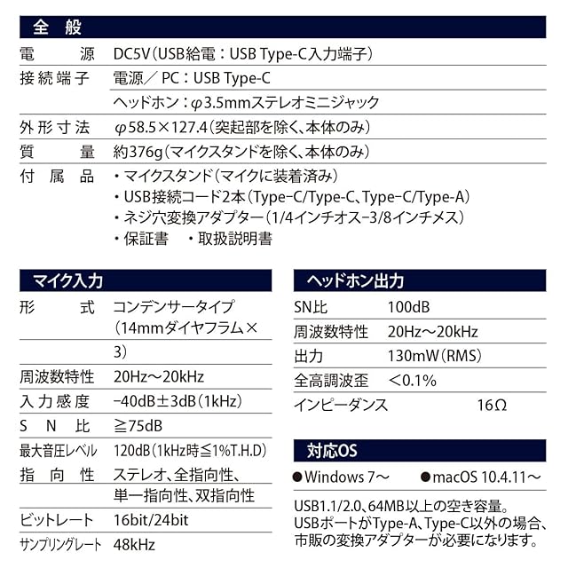 【 仕 様 】 ◆電源:DC5V(USB給電…USB Type-C入力端子) ◆接続端子:電源/PC…USB Type-C、ヘッドホン…φ3.5mmステレオミニジャック ◆外形寸法:φ58.5×127.4mm(突起部を除く、本体のみ) ◆質量:約376g(マイクスタンドを除く、本体のみ) ◆付属品:マイクスタンド(マイクに装着済み)、USB接続コード2本(Type-C/Type-C、Type-C/Type-A)、ネジ穴変換アダプター(1/4インチオス-3/8インチメス)、保証書、取扱説明書