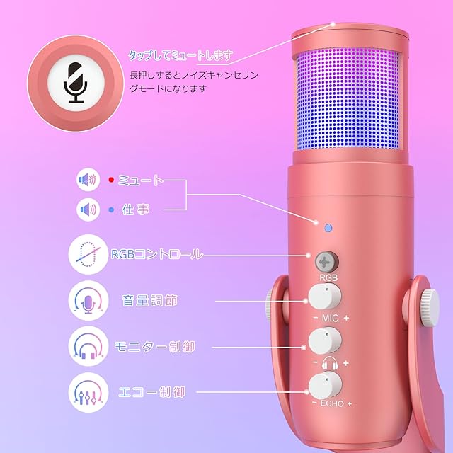 【制御可能で鮮やかなRGB照明】このUSB RGBマイクは、6つの静的およびグラデーションカラーの選択肢を提供します。 RGB ボタンを押して好みの照明効果を選択し、視覚的に素晴らしい体験を実現します。 RGB ボタンを長押しして、RGB ライトのオンとオフを切り替えます。 ゲーム、ライブ ストリーミング、ボーカル録音、ASMR、ブロードキャスト、ポッドキャスティング、YouTube、Facebook などのプラットフォームでの専門的な会議に最適です。