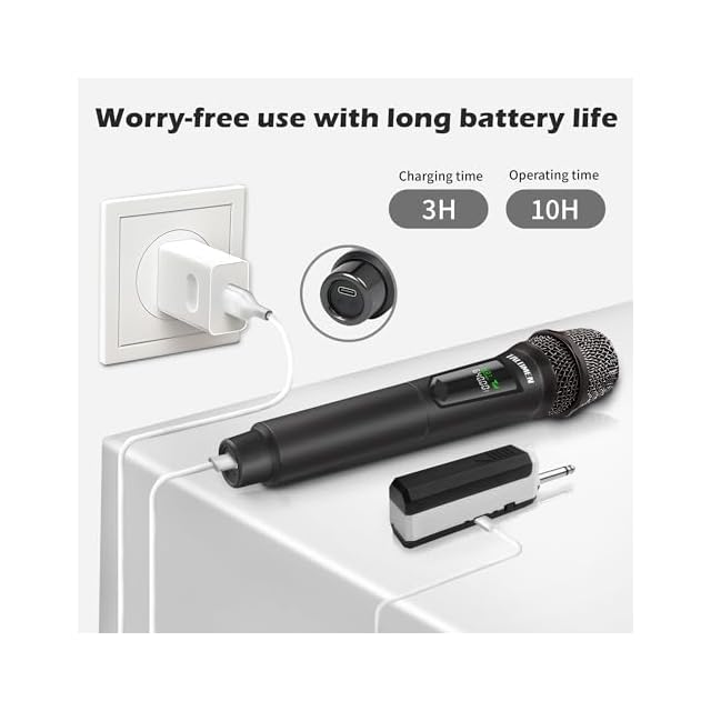 【長時間使用-充電式マイク】 マイクと受信機の両方を充電可能です。設定する必要はありません。電池を購入する必要はありません。 製品には1200mAhのリチウム金属充電池が3本(マイク用電池2本、レシーバー用電池1本)付属しており、電池を入れたらすぐに使用でき、カラオケマイクとして10時間以上の連続使用が可能です マイクとレシーバーの両方にUSB DC-5V充電ポートが付いているので、モバイルバッテリーを使用していつでも充電できます。