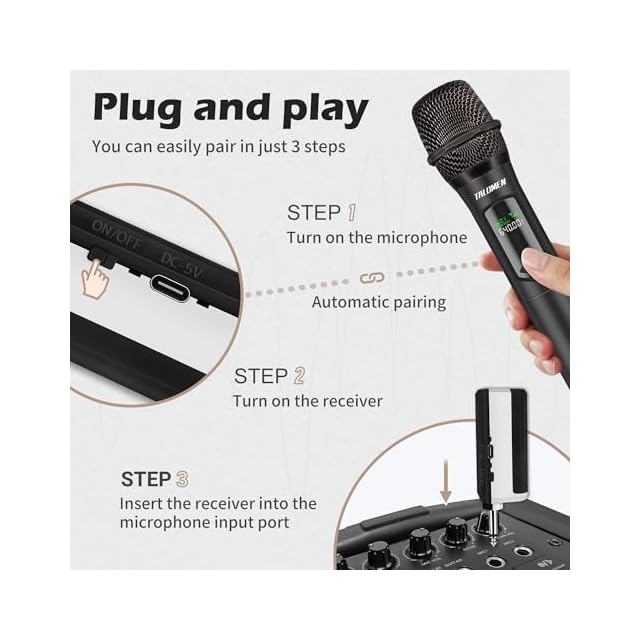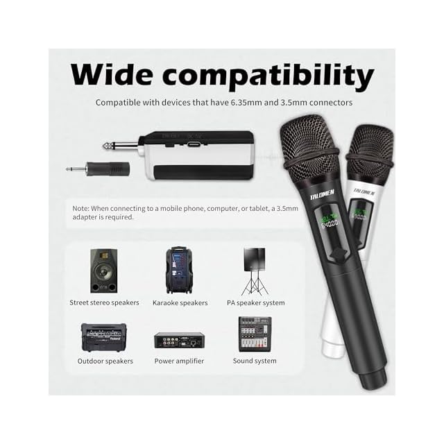 【幅広い互換性、様々な用途】このワイヤレスマイクは6.35mm プラグを付き、ミキサー、スピーカー、レコーダー、パ ワーアンプ、PAスピーカー、バス/カーオーディオ、DVDプレーヤーなどのmic in付きの入力端子設備との互換性があります。また、6.35-3.5mmアダプターが付属しており、より幅広いオーディオ機器と簡単に使用できるため、接続性が向上し、より楽しく便利に使用できる。高品質を追求する家庭KTV、会議、スピーチ、アウトドア、公演 、パーティー、結婚式、学校運動会、文化祭、観光、屋外イベント時のカラオケ大会、 忘年会、新年会、二次会、お花 見、キャンプの余興など様々なシーンに適用します。