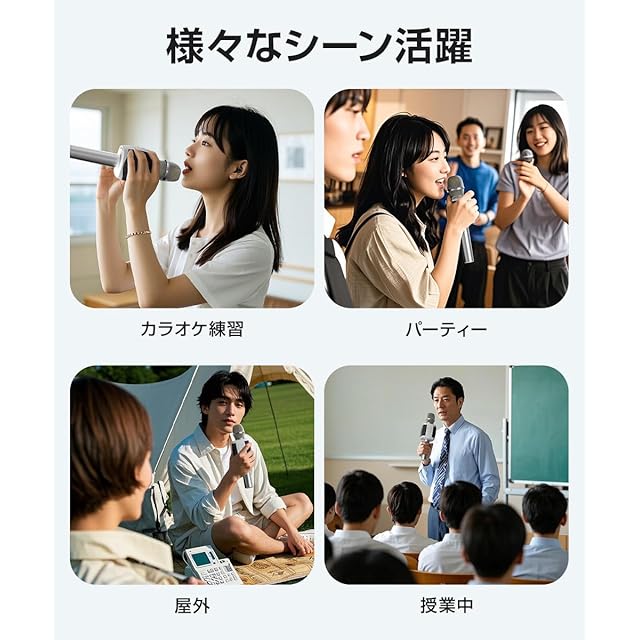 【一台多役・多機能 ワイヤレスマイク 】この ワイヤレスマイク は、 カラオケマイク としてはもちろん、録音・スピーカー・ライブ配信・司会・講義・会議など、あらゆる場面で活躍する多機能モデル。スマートフォンやタブレットとBluetooth接続するだけで、アプリ不要で即使用可能。家庭用からビジネスまで、これ1本でOK!