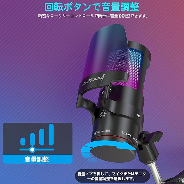 【クールなダイナミックRGB照明効果】ZealSound KM8 シリーズのゲーム用コンデンサーマイクは、魅力的なダイナミックな多色グラデーション効果を備え、没入感のあるゲーム体験と個性的な演出が可能です。マイク本体のRGBコントロールタッチボタンに触れるだけで、RGBモードの切り替えやオフにすることができます。