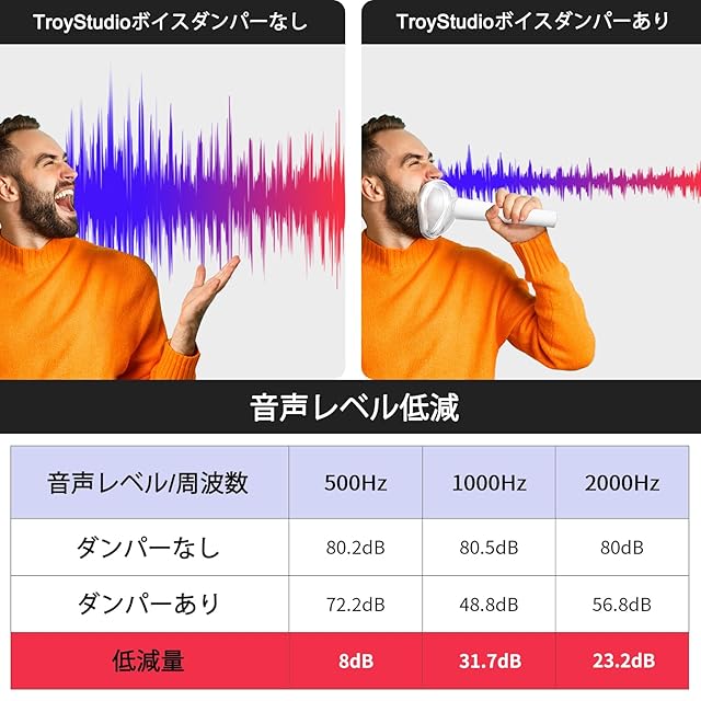 【格段に音量を低減】TroyStudio防音マスクは、最大32dBまでボーカルの音量を低減することができます。音がサプレッションチューブに入ると、まず内部の調節板に跳ね返って放散され、次に中間の音響フォームにぶつかって吸収され、最終的には32dBまで下げることができます。この2段階のプロセスを経て最終的にかなり低減されます